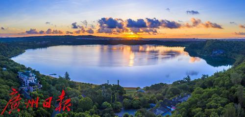 朝阳映照湛江湖光岩景区玛珥湖,玛珥湖是火山喷发后形成的特殊火山口湖。