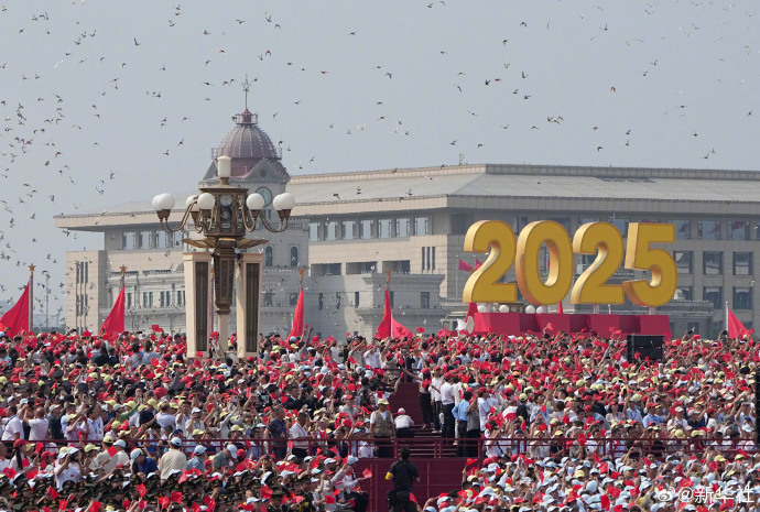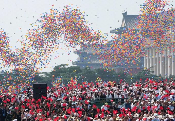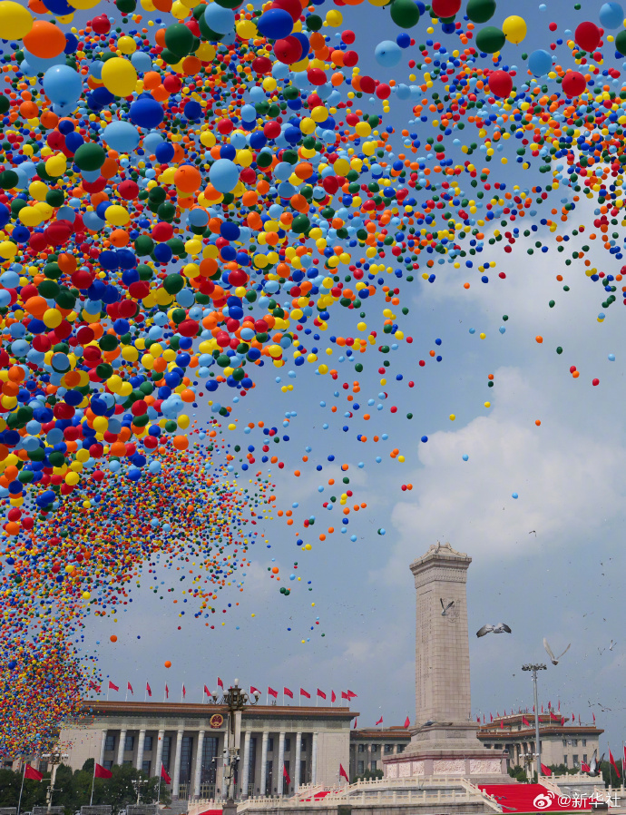 和平鸽展翅高飞,彩色气球腾空而起!回望峥嵘的血火岁月,让我们以山河为证、以日月为铭,共同见证,英雄的中国人民永远不屈,和平的阳光永远灿烂!让我们为胜利喝彩,为祖国点赞!