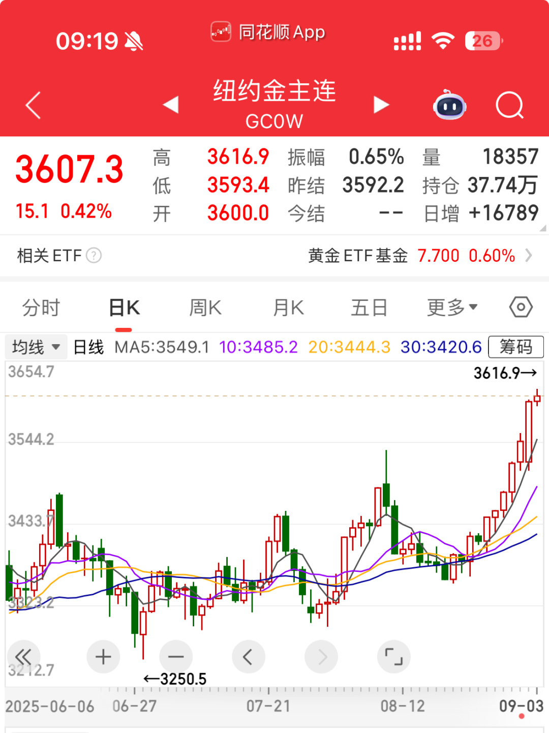 9月3日,现货黄金站上3540美元/盎司,日内涨0.22%。纽约期货金价创下首次站上3600美元关口,创历史新高。截至发稿前,纽约金主连报3607.3美元/盎司。