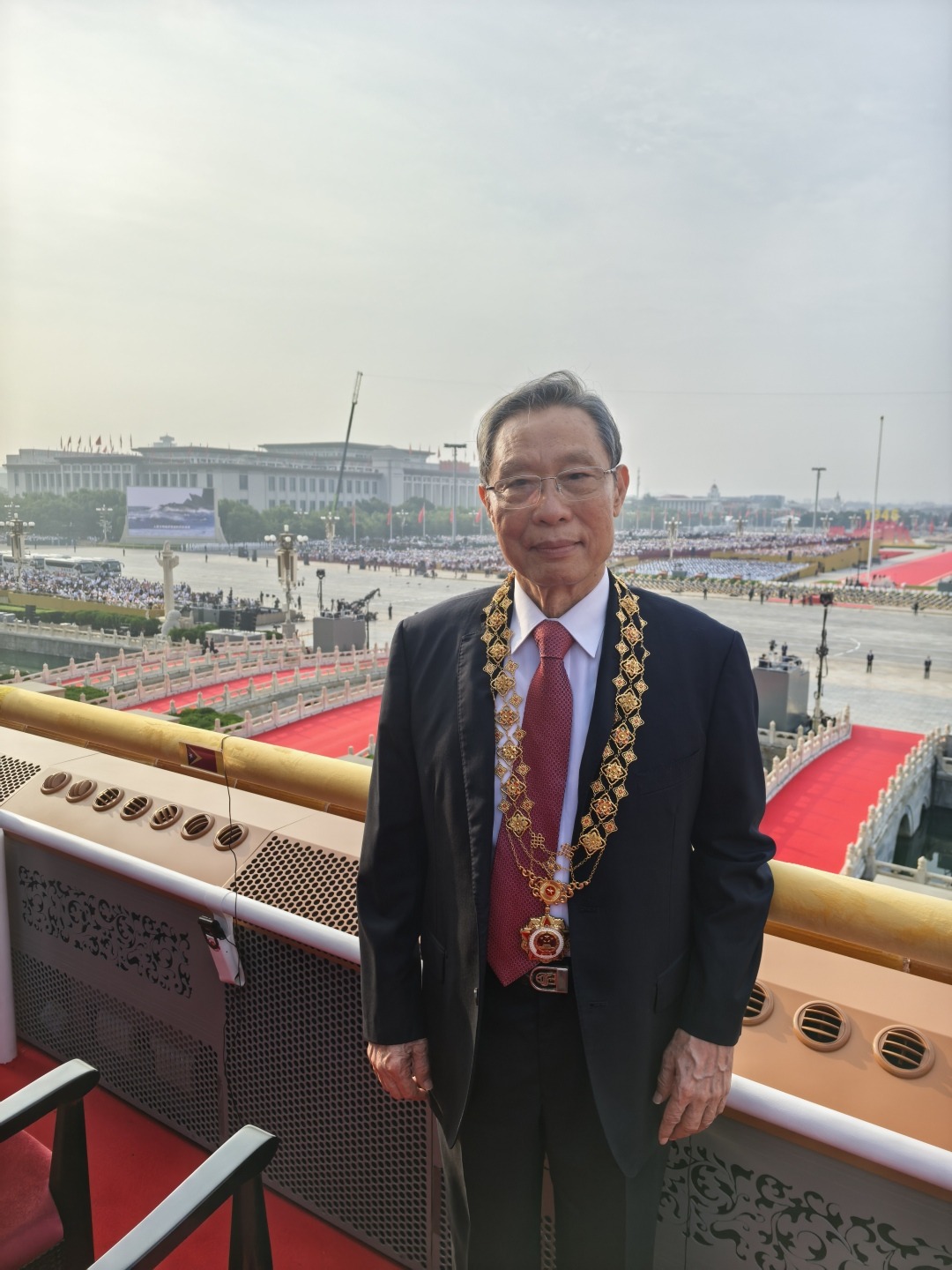 钟南山向记者表示:“今天非常荣幸能够亲眼看到阅兵场上国家先进的军事装备和震撼的人民军队,我现在心情激动澎湃,久久不能平复。我是1936年出生的,1937年日本轰炸南京,1938年轰炸贵阳中,把我的家都炸了,差点让我‘死’过两次。”1936年10月,钟南山出生于南京,不到2岁时就随父母到了贵阳,他的童年就在贵阳开启。“我还非常记得1945年,贵阳城里人们在街上烧放鞭炮欢天喜地庆祝,才知道日本投降了。作为20世纪30年代出生的人,我见证着国家由贫转富,从弱到强的过程。今天让我感受最深的是国家真正强大起来了,保护我们免受战争的苦难,同时维护世界和平,而这一切,都来之不易,让我非常激动。祝伟大的祖国繁荣昌盛!”