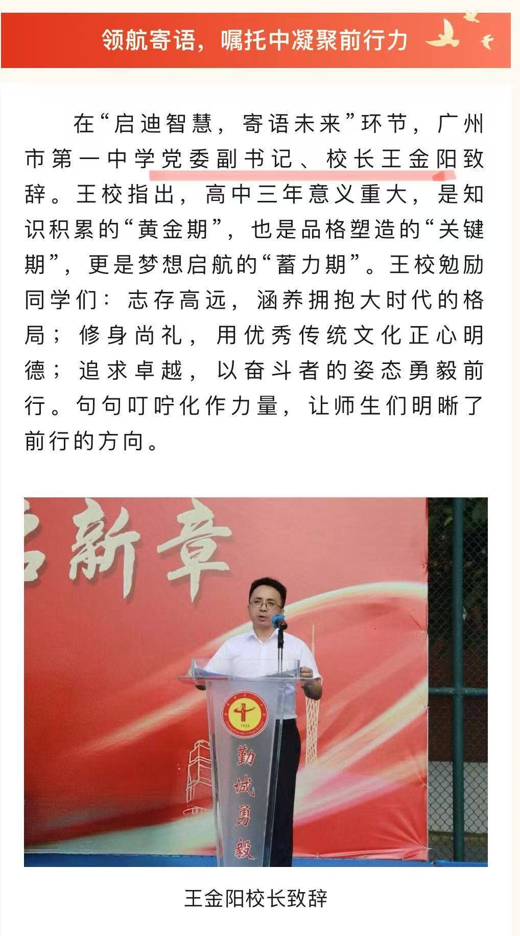 广州市第一中学创办于1928年,是广州市第一所公立中学,新任校长为王金阳。此前,王金阳担任广州市第四中学校长。