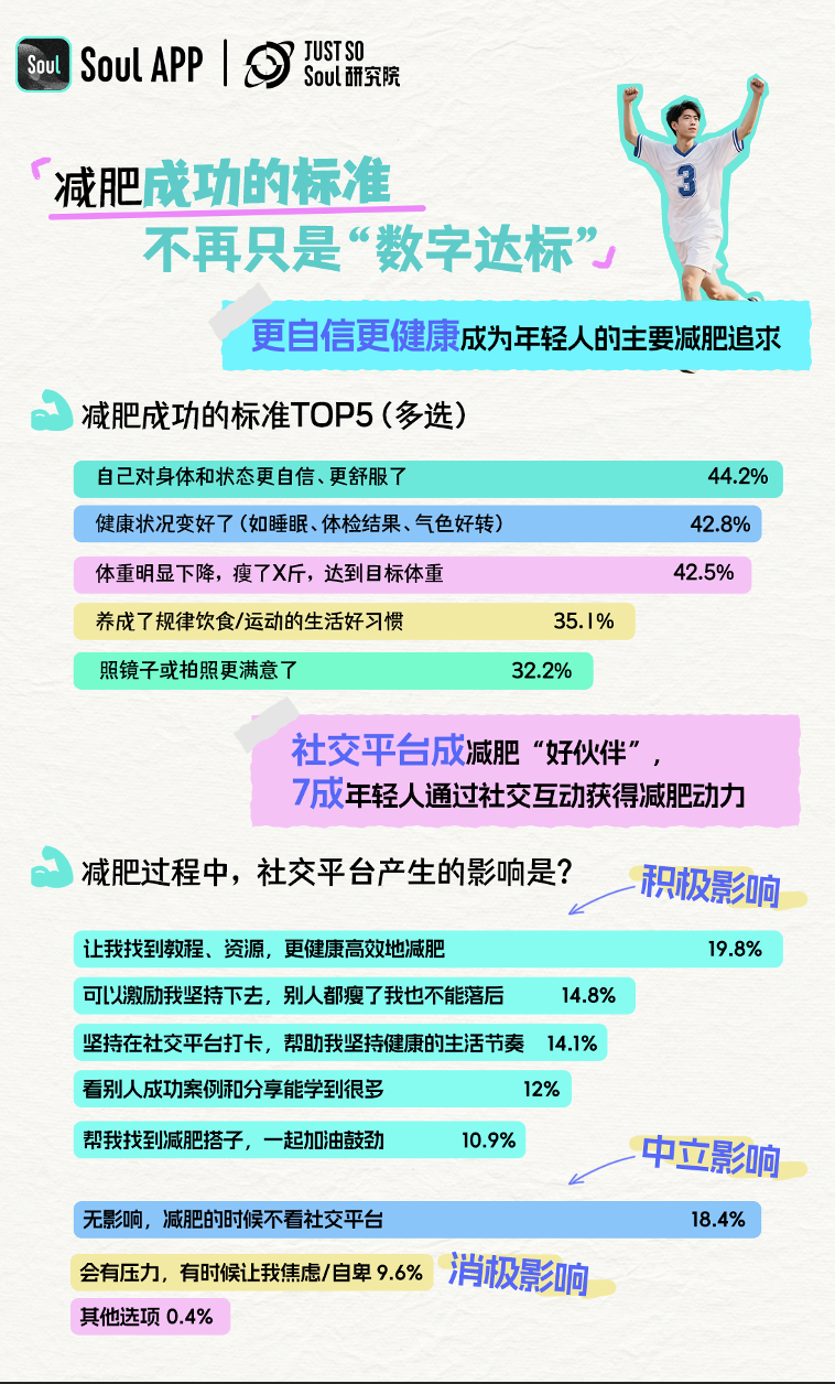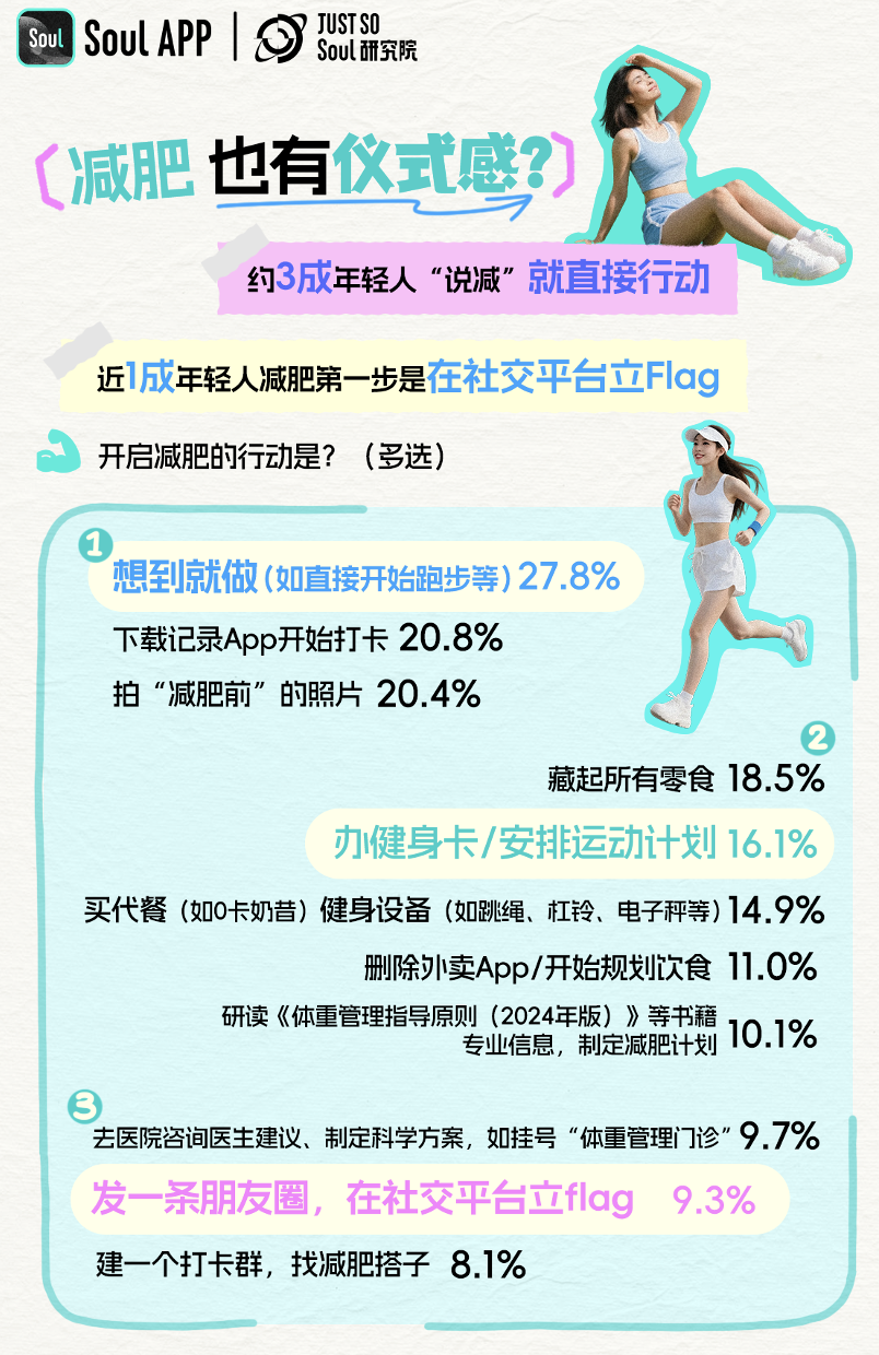 2025年,由国家卫生健康委等部门发起的“体重管理年”活动持续推进,让“健康”“减肥”进一步成为全民话题和讨论热点。在社交平台Soul App上,截至8月底,与减肥相关话题的瞬间内容达到97万条。关于减肥,年轻人有巨大的分享、讨论与行动的热情。