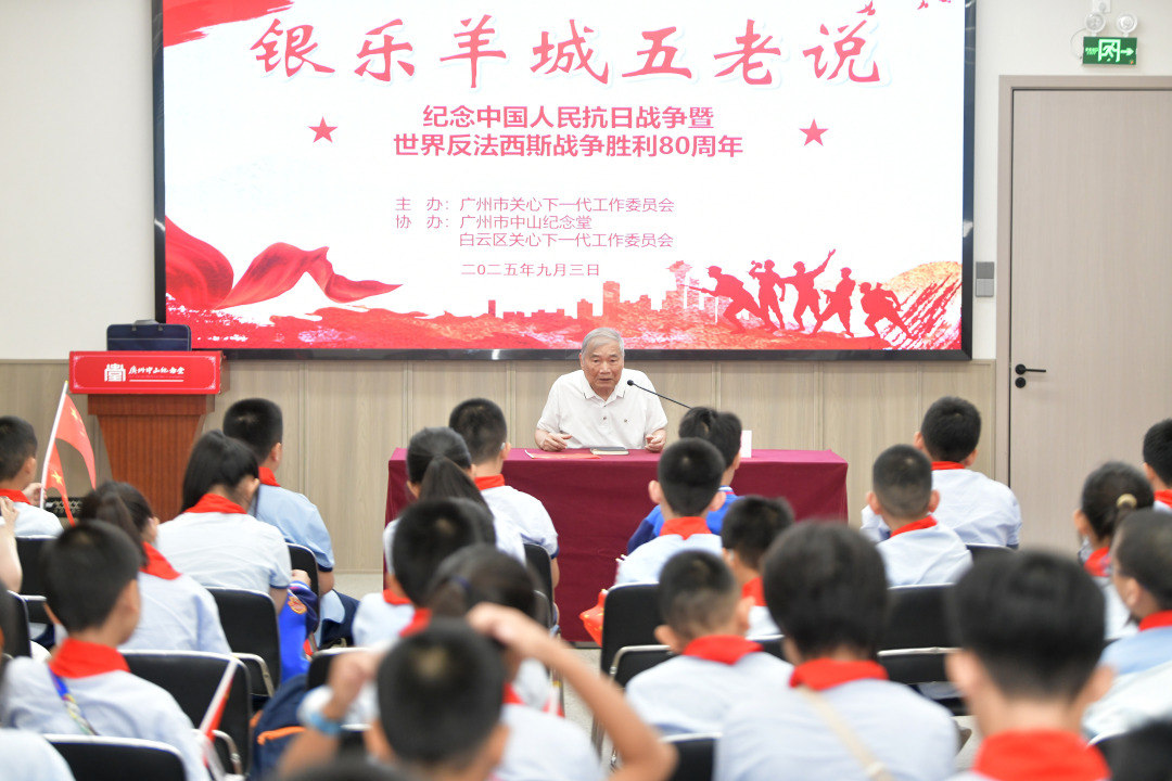 今年是中国人民抗日战争暨世界反法西斯战争胜利80周年。9月3日上午,在阅兵直播结束后,广州市关心下一代工作委员会联合中山纪念堂、白云区关工委,在庄严的中山纪念堂共同举办“银乐羊城五老说”志愿宣讲活动,聆听东江纵队司令员曾生之子曾德平亲述烽火岁月中的抗战故事,共同缅怀革命先辈,继承富强中华之志,让伟大抗战精神薪火相传。