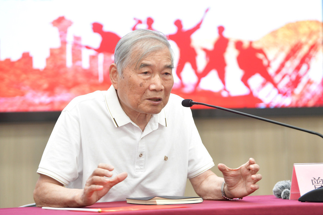 阅兵仪式直播结束后,已是满头白发的东江纵队司令员曾生之子曾德平走上讲台,以亲历者后代的视角,深情地为青少年们讲述父亲及其战友们的抗战事迹。