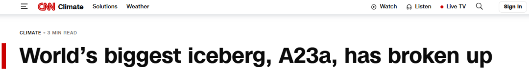 自1986年从南极菲尔希纳冰架断裂以来,A23a冰山曾因卡在海床上,在威德尔海搁浅逾30年,后由于冰层融化等作用在2020年前后开始向北移动。今年3月,A23a停留在南大西洋南乔治亚岛附近海域,科学家一度担忧它与岛屿发生碰撞,可能威胁企鹅、海豹等动物生存。今年5月,这座冰山再次移动,向北漂流。最近几周以来,A23a的漂流速度明显增快,有时候一天最远能漂20公里。