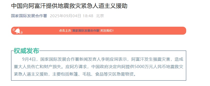 9月4日,国家国际发展合作署新闻发言人李明应询表示,阿富汗发生强震灾害,造成重大人员伤亡和财产损失。应阿方请求,中国政府决定向阿提供5000万元人民币地震救灾紧急人道主义援助,主要包括帐篷、毛毯、食品等灾区急需物资。