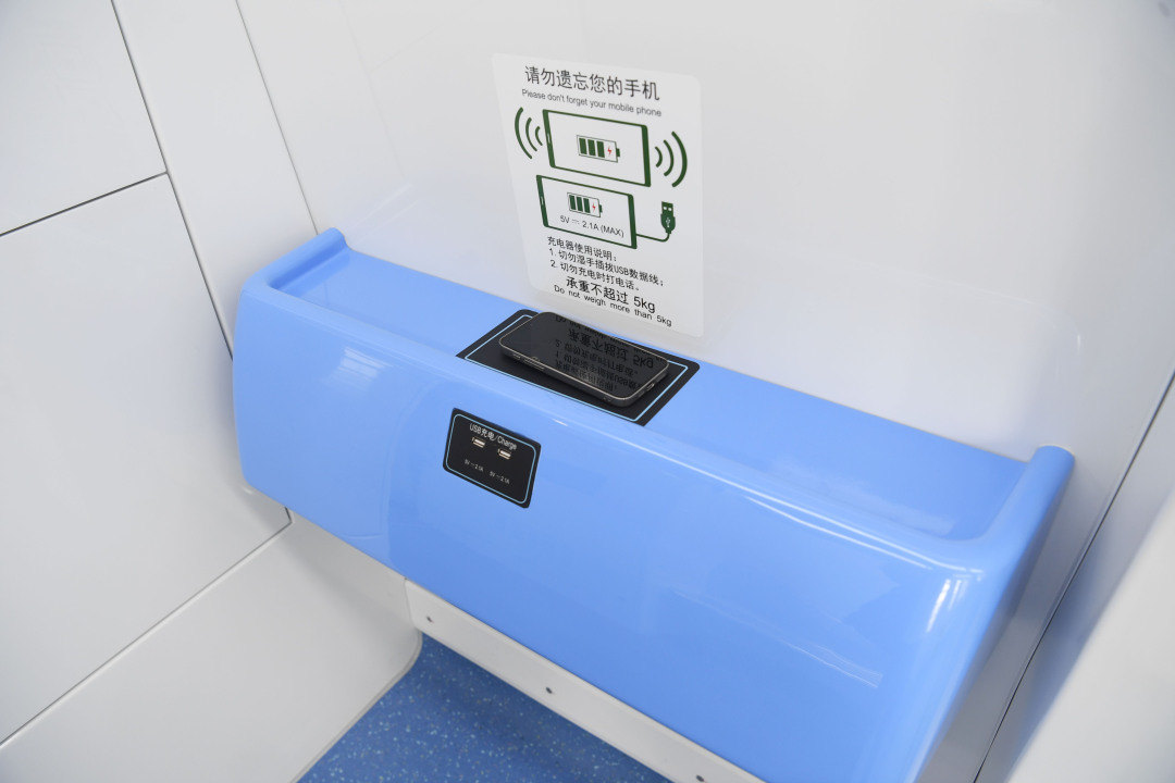 为解决乘客“电量焦虑”,列车每节车厢均配备充电区域,支持无线、有线两种充电方式,乘客将支持无线充电的手机放在指定区域即可充电。