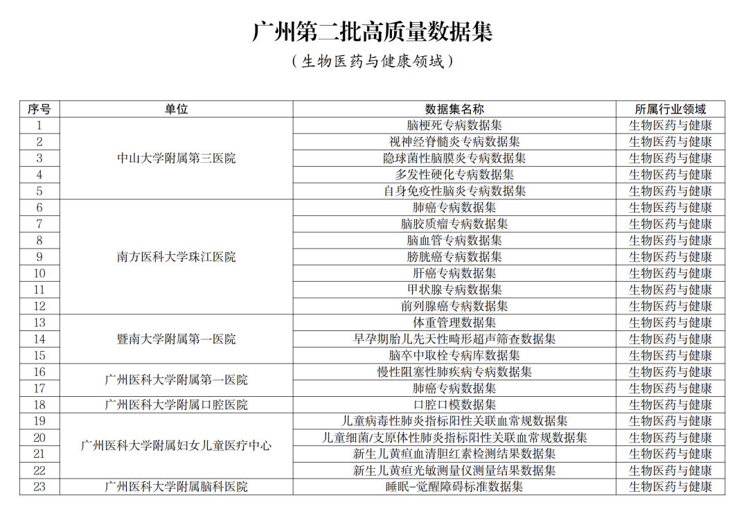 近日,广州市政务服务和数据管理局官网公布了“广州第二批高质量数据集名单(生物医药与健康领域)”,共7家医疗机构23个高质量数据集入选。