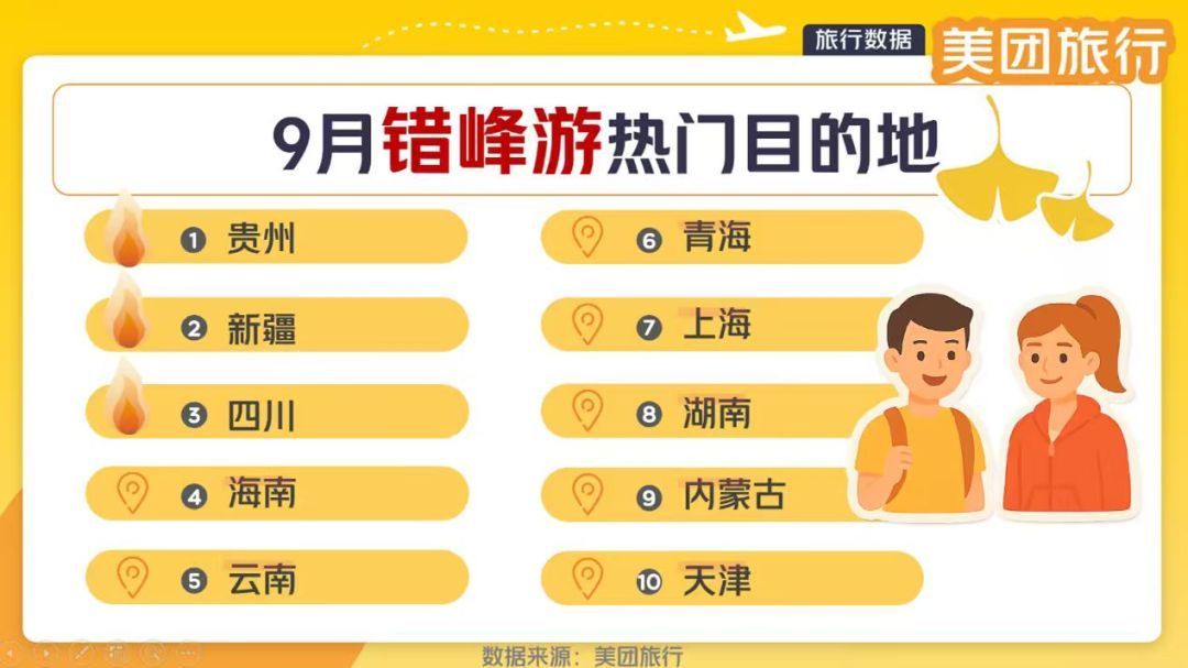 近期,广州市民错峰游性价比很高。以广州飞往北京、成都、海口、昆明等地的机票为例,最低参考价格普遍在2折左右,并且将持续至9月25日。美团旅行数据显示,9月国内十大“错峰游”目的地为:贵州、新疆、四川、海南、云南、青海、上海、湖南、内蒙古、天津。其中海南9月文旅增速同比上涨58%,位列全国第4位。