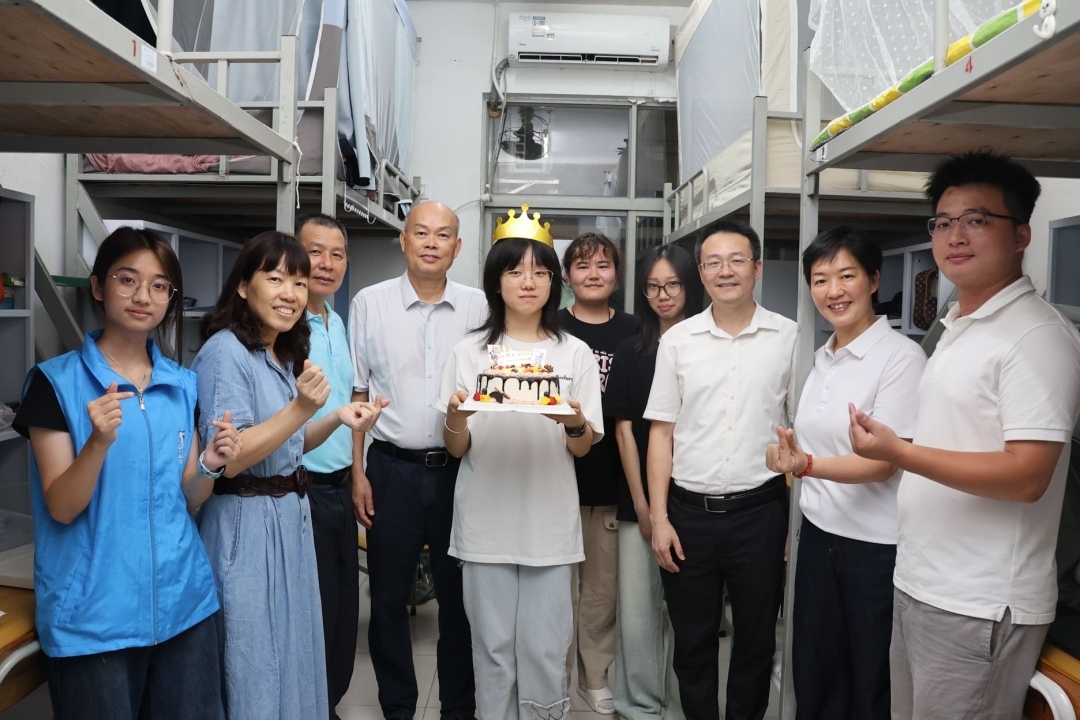 当天晚上,广东医科大学党委书记、校长卢景辉带队,给开学当天过生日的学生送上生日蛋糕,让寿星们体验一个非常特别的生日。2025级公共卫生学院的李梓玲就是寿星之一,卢景辉给她送去成人礼蛋糕。她高兴地表示:“很惊喜能够收到学校的礼物,本来还以为今年的生日会一个人过,没想到学校给我准备了蛋糕和学习用品,非常感动。”