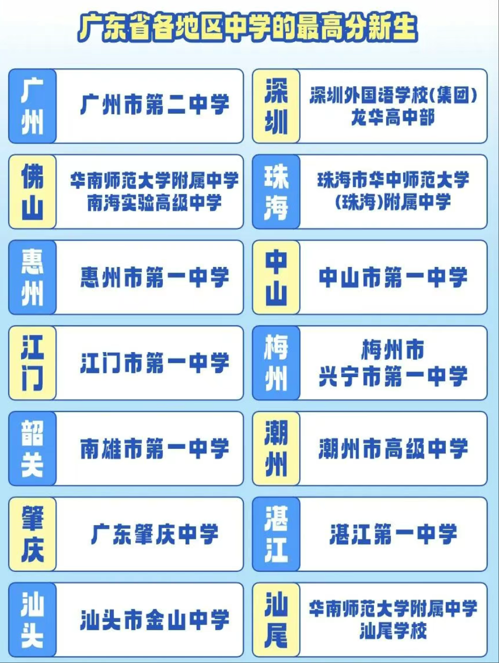 广州医科大学今年在广东省各地区录取的最高分新生的生源高中(截图自广州医科大学公众号)