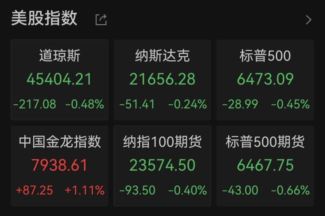 截至北京时间23:30,道指跌0.48%,纳指跌0.24%,标普500指数跌0.45%。中国金龙指数涨1.11%,纳指100期货跌0.40%,标普500期货跌0.66%。