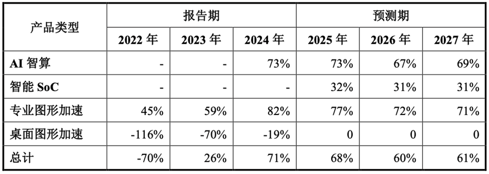 根据回复函以及其中提到的申报材料,摩尔线程自主研发四代GPU架构,并基于此推出了十余款GPU板卡模组、一体机和KUAE集群等产品。摩尔线程2025年上半年收入为7.02亿元,研发费用达到5.57亿元,亏损2.71亿元,公司预测最早可于2027年实现合并报表盈利。虽然该公司AI智算产品、图形加速产品及智能SoC产品在国内市场相应细分领域的市场占有率在2024年还不足1%,但其AIPC及智能模组已于2025年上半年对外销售;SoC芯片主要面向新能源汽车的智能座舱,预计将于2026年导入并量产。另外,摩尔线程2025年AI智算和专业图形加速两项业务的毛利率预测均可以达到77%,至2027年亦可基本分别稳定在69%和71%。