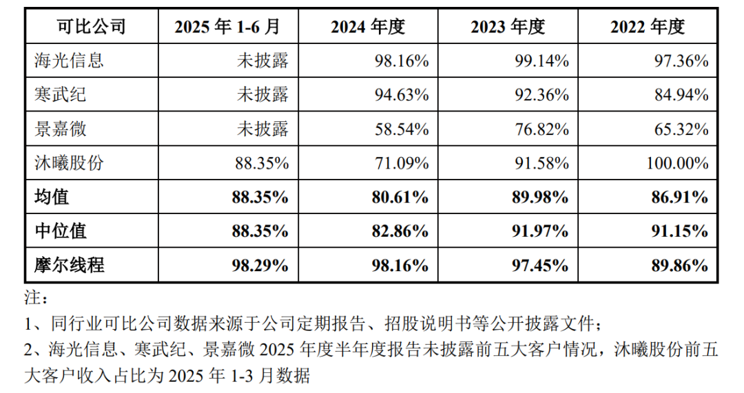 值得注意的是,摩尔线程客户集中度较高,且从2022年至今逐年提高。今年上半年摩尔线程主要向前五大客户卖出AI智算集群设备、AI智算板卡、专业图形加速卡等产品,销售额接近6.9亿元,占主营业务收入比例达到98.29%。对此,摩尔线程解释,客户集中度较高为 AI 芯片企业的行业惯例,公司的前五大客户集中度水平与行业特点一致。回复函引用的资料显示,除景嘉微外,公司可比公司报告期内前五大客户销售占比均在 70%以上,其中海光信息向前五大客户销售占比维持在 97%以上,寒武纪向前五大客户销售占比维持在 84%以上。因此,摩尔线程认为,公司客户集中度较高,但具备合理性。