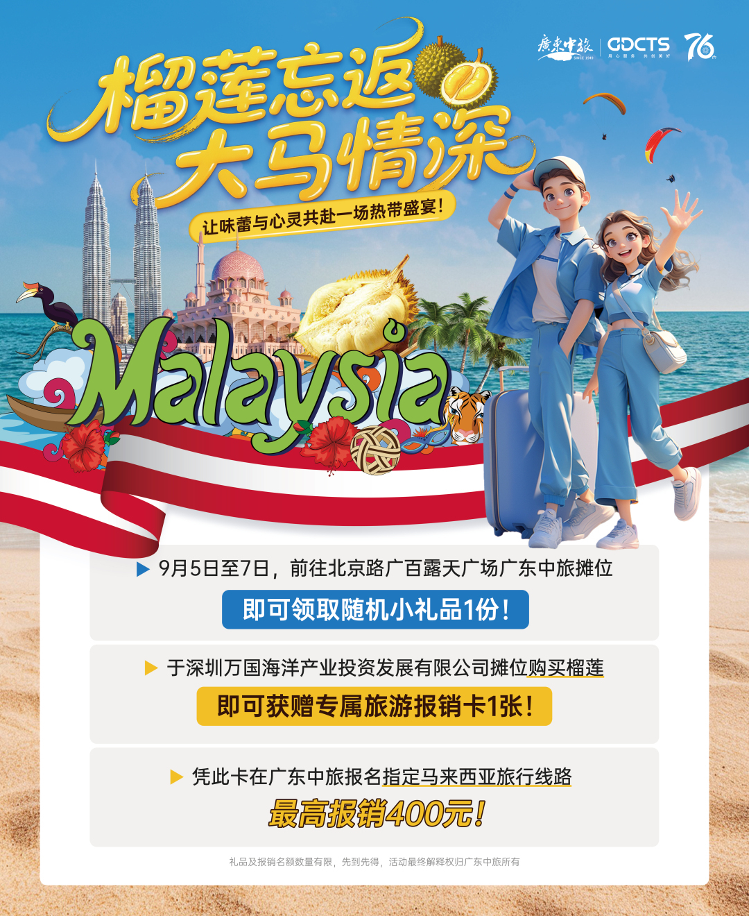 广东中旅市场推广中心总经理彭杰表示,旅行社为本次活动提供了许多特别福利,比如这个周末前往北京路广百露天广场广东中旅摊位,即可领取随机小礼品1份。同时,旅行社还和现场摊位形成联动,在现场深圳万国海洋产业投资发展有限公司摊位购买榴莲,即可获赠专属旅游报销卡1张,凭该报销卡在广东中旅报名指定马来西亚旅行线路,最高可报销400元:“正是马来西亚榴莲季,我们也推出了一系列品尝美食的路线产品。”彭杰表示,国庆假期期间前往马来西亚海岛游比较热门,比如到仙本那体验酒店、潜水等,都很受游客欢迎。