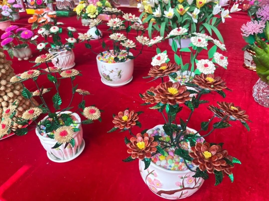 今年的花卉作品也别具一格,谷粒、米粒、丝网、扭扭棒等材料制成的花卉各显其美,更有“变废为宝”的塑料泡沫鲜花焕发新姿。祠堂两侧的两株桃花尤其吸睛,粉红花瓣开得灿烂,仿佛春日重临。