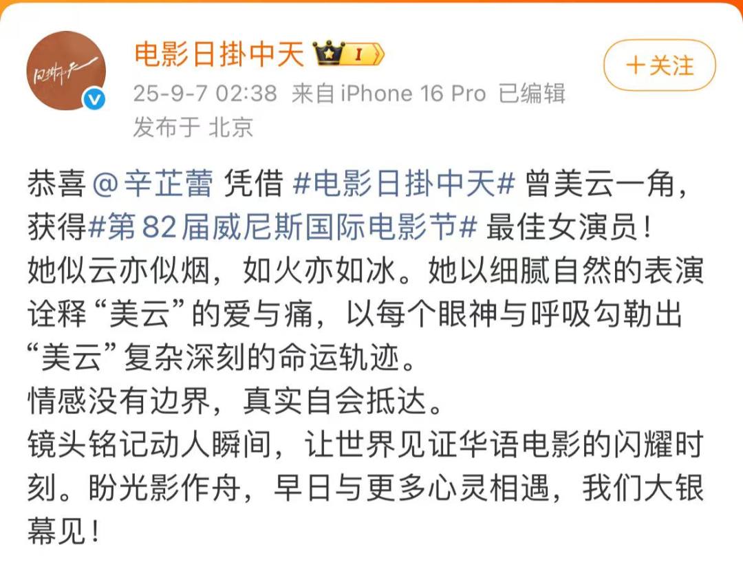 获奖后,@电影日掛中天发文祝贺辛芷蕾:“她以细腻自然的表演诠释‘美云’的爱与痛,以每一个眼神与呼吸勾勒出角色复杂而深刻的命运轨迹。”@辛芷蕾工作室 也发文表示:“祝你享受这一刻,也愿未来能拥有更多这样的时刻。”随后还发布了辛芷蕾的获奖照片,配文“祝你永远有梦可做”。