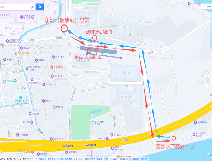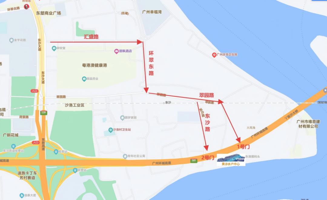 如市民选择自驾或打车前往,则可导航输入“黄沙水产中心”,如从1号门入,可选择东沙大道 → 汇盛路 → 环翠东路 → 翠园路 → 1号门这条路线;如从2号门入,可选择东沙大道 → 汇盛路 → 环翠东路 → 东沙路 → 2号门这条路线。