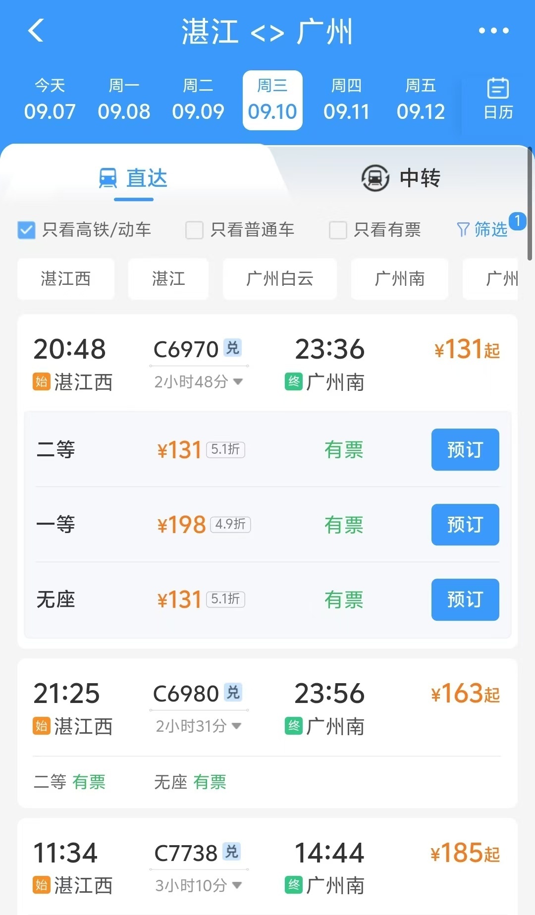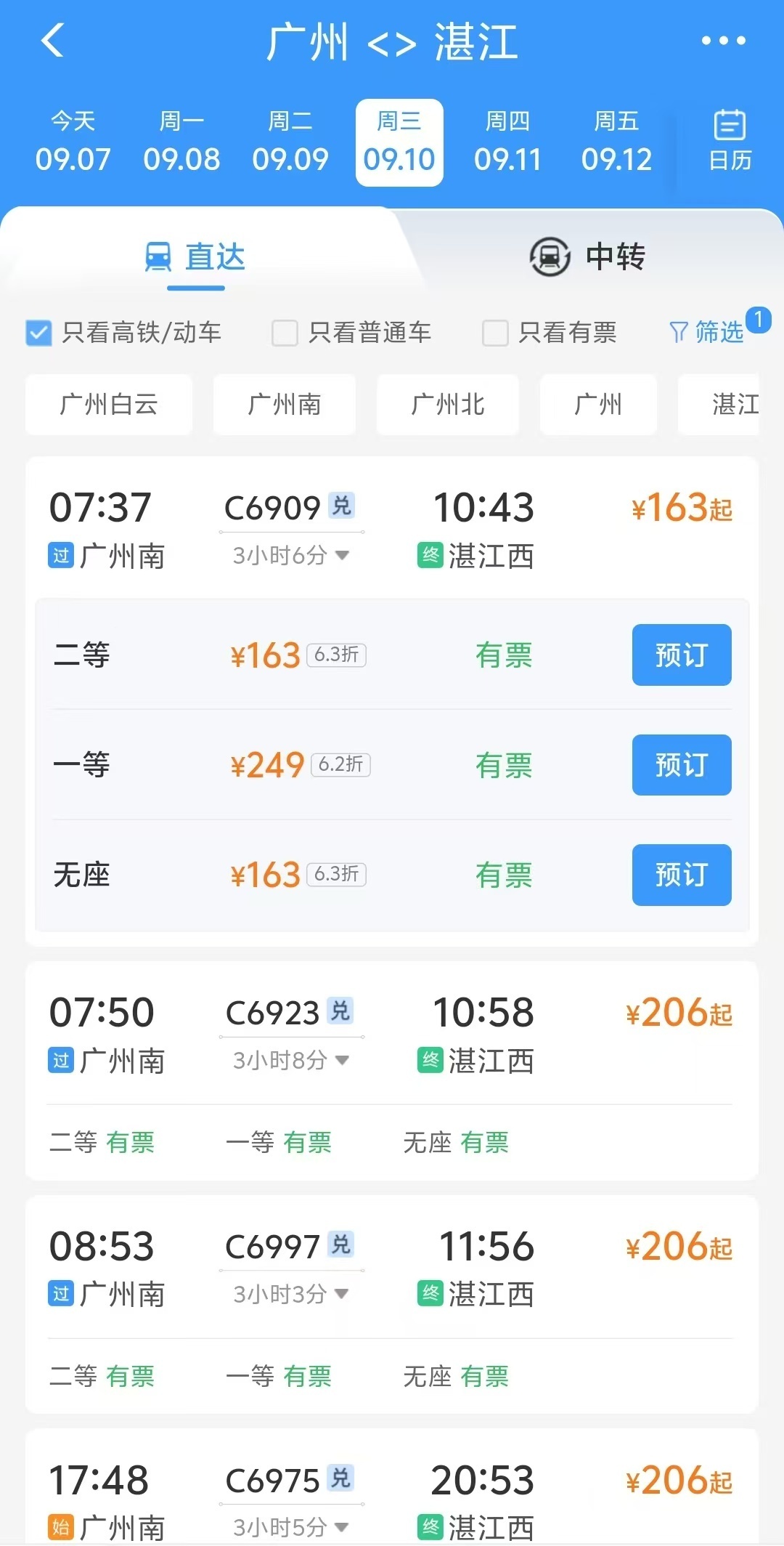 9月9日起未来两周,广州南站至湛江西站方向,只有少数几趟列车票价不打折,二等票打折档次分为6.3折、8折、8.8折。其中,07:37开车的C6909次票价最低,二等票6.3折、163元,一等票6.2折、249元;08:53开车的C6997次和17:48开车的C6975次两趟列车,二等票8折、206元;一等票7.9折,318元;另有20多趟车次一、二等票均打8.8折,分别为358元、228元。未来两周的其他日期也基本一致。