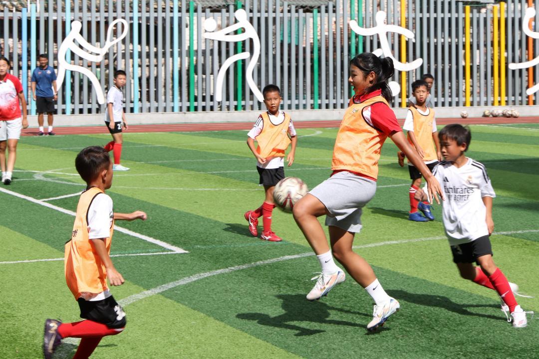 分享会后,U16女足的五名运动员化身专业教练,指导校足球队队员,让小队员们快速掌握进阶技巧。
