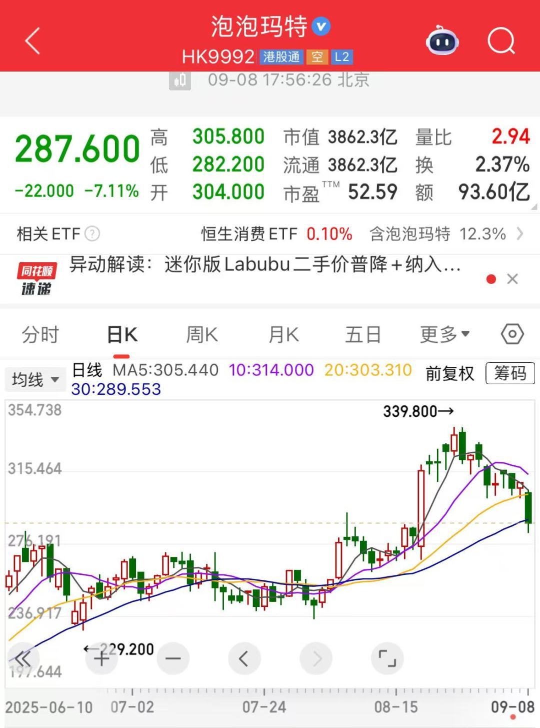 9月8日,泡泡玛特(09992.HK)股价持续下挫,日内跌幅超7%。截至发稿前,公司股价报287.60港元/股,市值3862.3亿港元,较上一个交易日蒸发295.45亿港元。