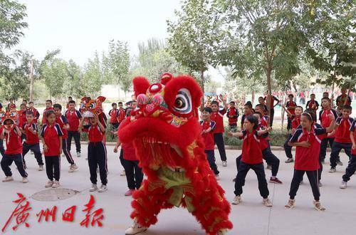 华南师范大学赴疆“三下乡”社会实践队在吾库萨克镇中心小学开展舞狮基本动作教学。