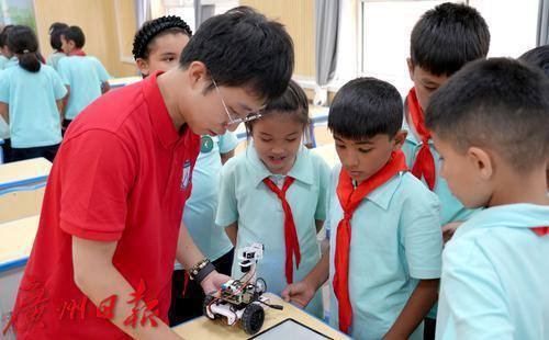 华南师范大学赴疆“三下乡”社会实践队在疏附县第二小学为学生操作演示智能小车。