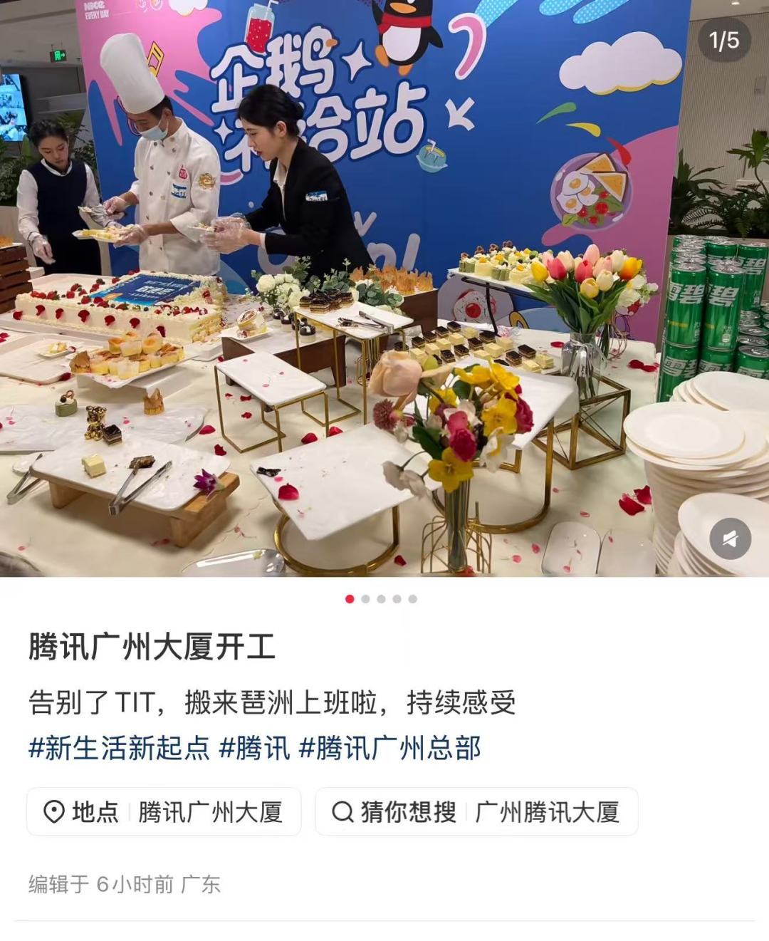 9月8日,记者从相关人士处了解到,腾讯广州总部大楼正式搬迁启用。在社交媒体上,有网友晒出了乔迁仪式现场,不仅有舞狮表演,更有丰富精美的茶点、礼物等,非常热闹。现场摆设的背景板上写着“珠江潮起,腾跃星辰”。