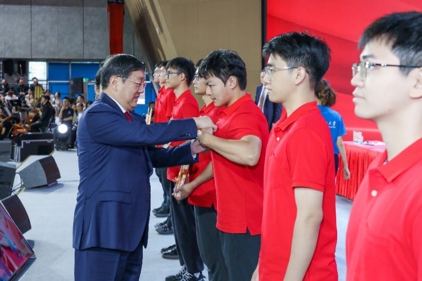 校徽是华工精神的具象凝练。唐洪武、吴波、许勇分别在三个校区典礼会场为新生代表佩戴校徽,并赠送入学礼。