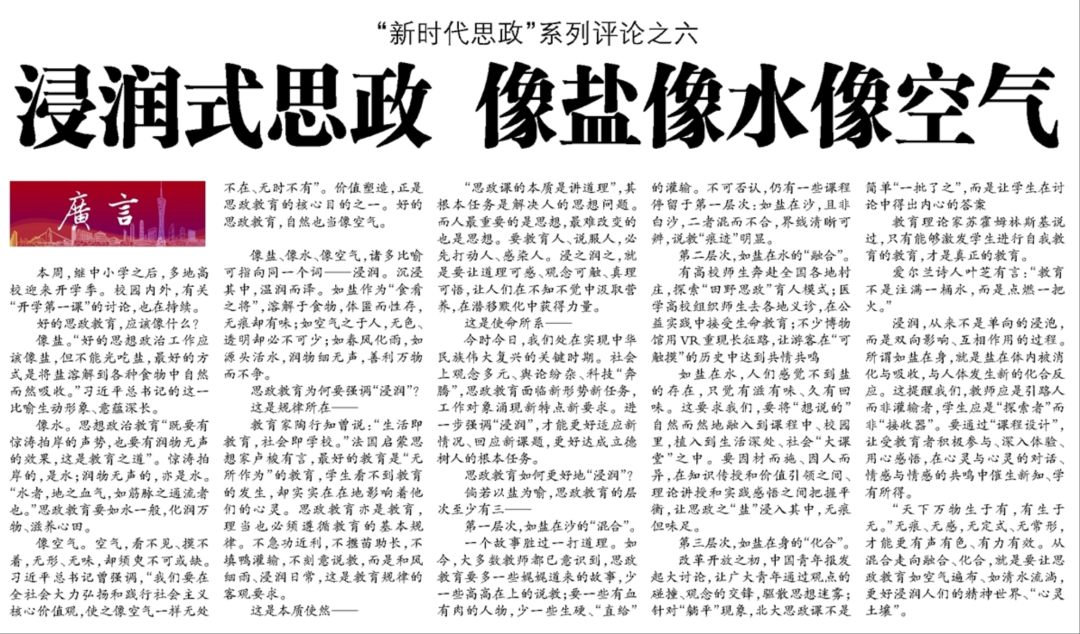 9月8日,《广州日报》刊发评论《浸润式思政像盐像水像空气》(详情),阐释思政教育应强调 “浸润” ,好的思政教育是让道理可感、观念可触、真理可悟,如空气遍布、如清水流淌,浸润人们的精神世界、“心灵土壤”,使受教育者积极参与、深入体验、用心感悟、学有所得、主动践行。