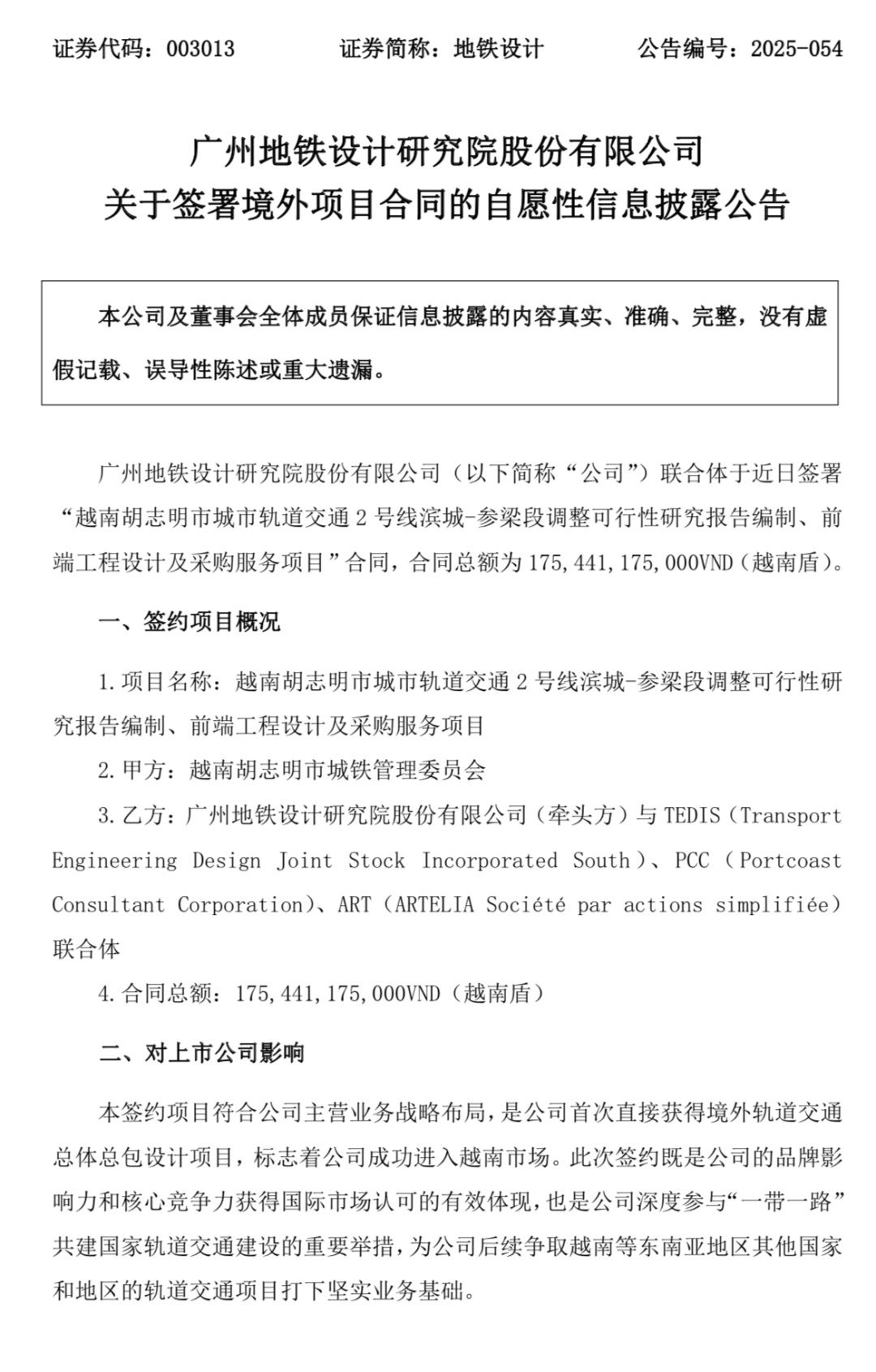 记者今天获悉,广州地铁设计研究院股份有限公司牵头的联合体于近日签署“越南胡志明市城市轨道交通2号线滨城-参梁段调整可行性研究报告编制、前端工程设计及采购服务项目”合同,合同总额为175,441,175,000越南盾(约4735万元人民币)。