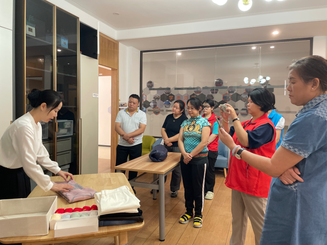 9月9日上午,由大东街道羊城家政基层服务站、大东街就业驿站、中山三社区、广州市轻工技师学院联合打造的“技能赋能生活・收纳点亮家居”整理收纳专项培训班在广州市轻工技师学院东校区的实操室内举行。衣物的折叠声与热烈的讨论交织成曲,越秀区首个“羊城技能加油站”正式启动技能输送计划。40名学员在2小时内体验了一场从理论认知到双手实践的家居收纳,也踏出了将技能转化为就业竞争力的第一步。