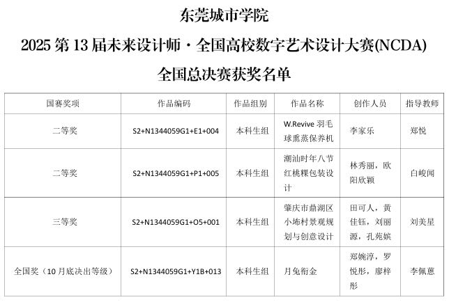 据了解,NCDA大赛是艺术设计领域权威赛事,入选全国高校竞赛排行榜。本届大赛,东莞城市学院高度重视赛事组织工作,积极营造“以赛促教、以赛促学”的良好氛围,全校师生踊跃参与,共提交103件参赛作品。经过多轮激烈角逐,学校最终收获国家级奖项4项(含二等奖2项、三等奖1项、待评审1项)、省级奖项26项(含一等奖6项、二等奖8项、三等奖12项),获奖总数较上一届大赛大幅提升,创下历史同期最佳成绩。