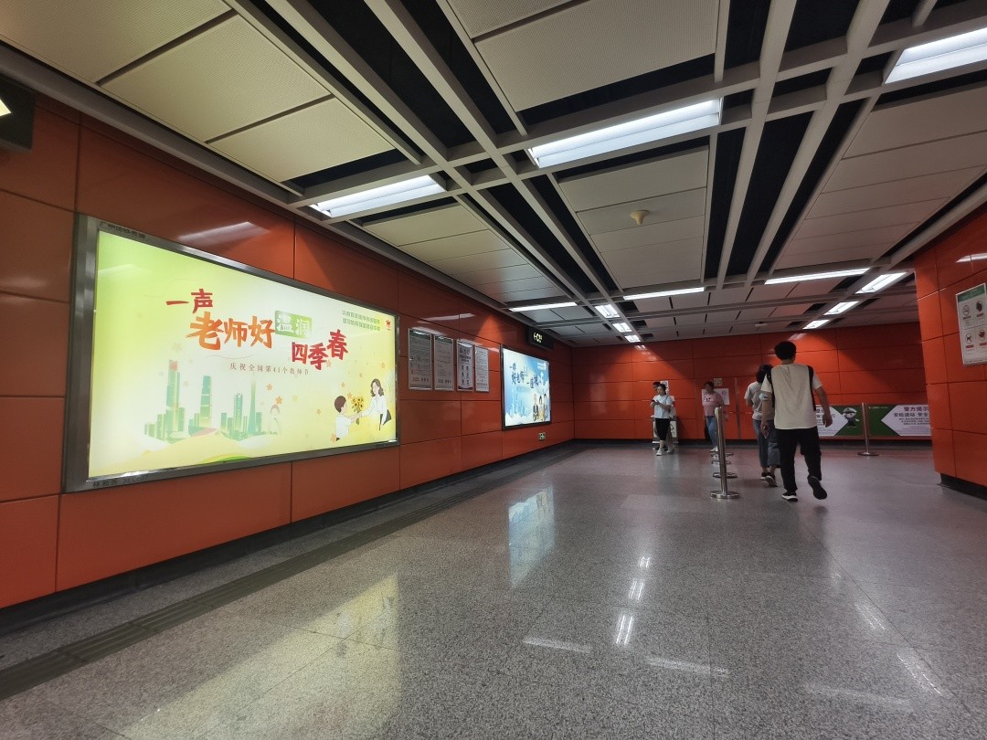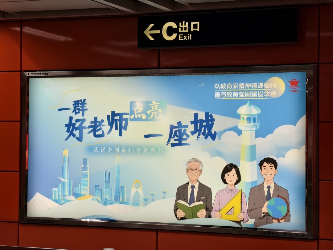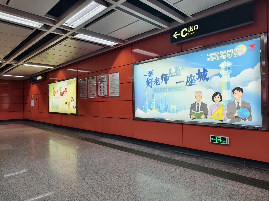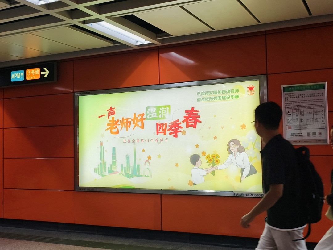 9月10日,广州地铁北京路、江南西、海珠广场、华师、广州火车站、西村、小北等多个站的站厅、站台推出教师节祝福公益海报。