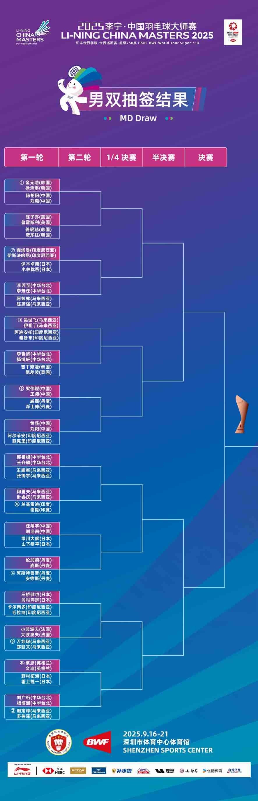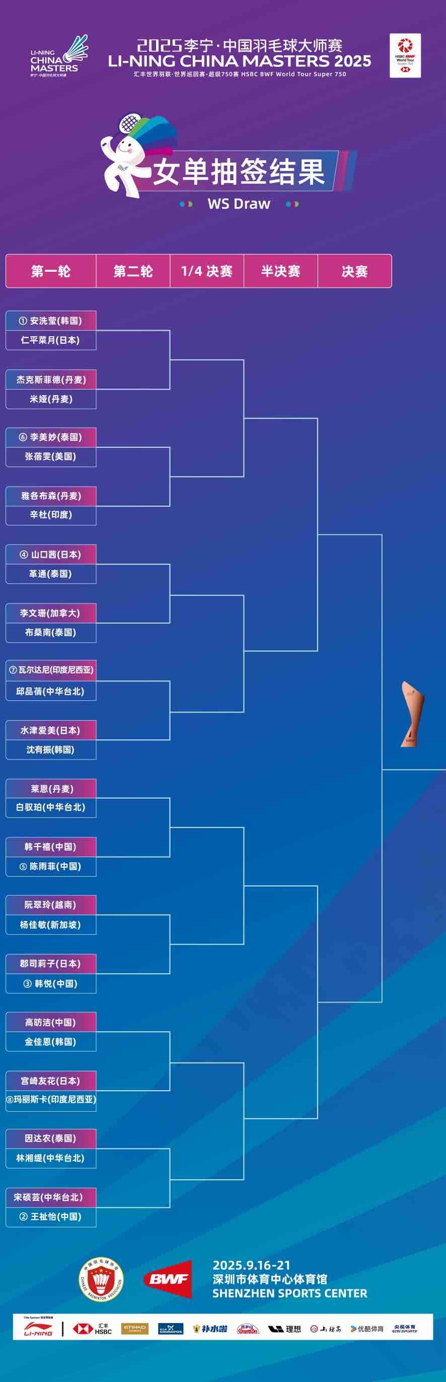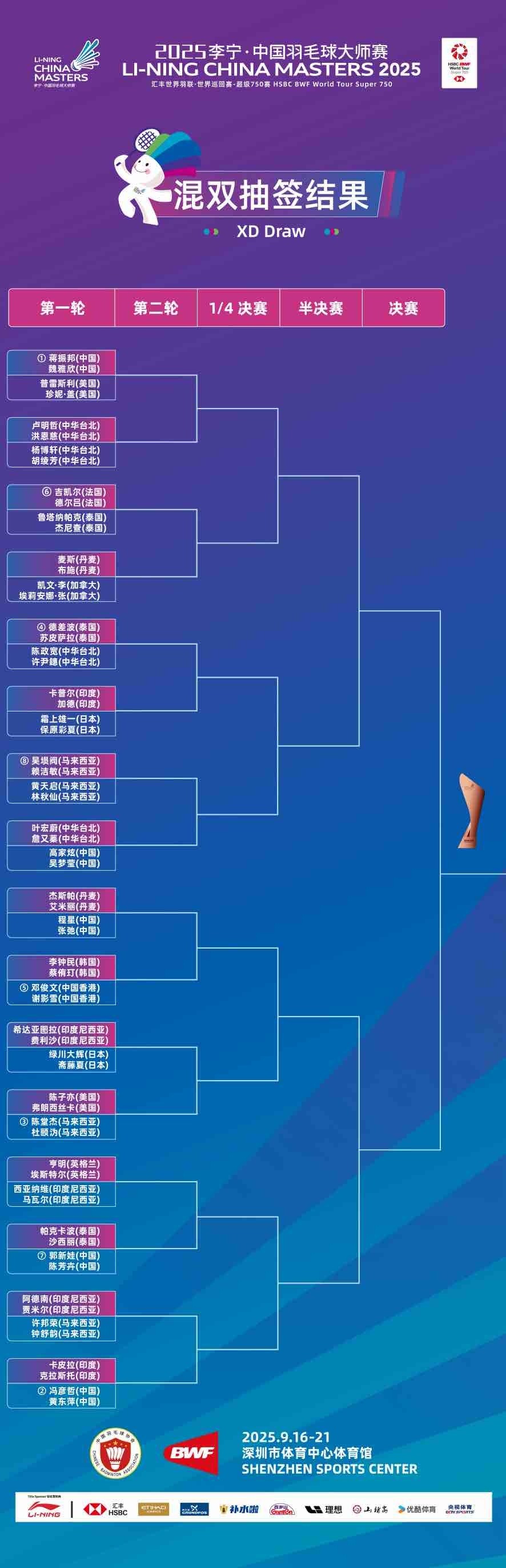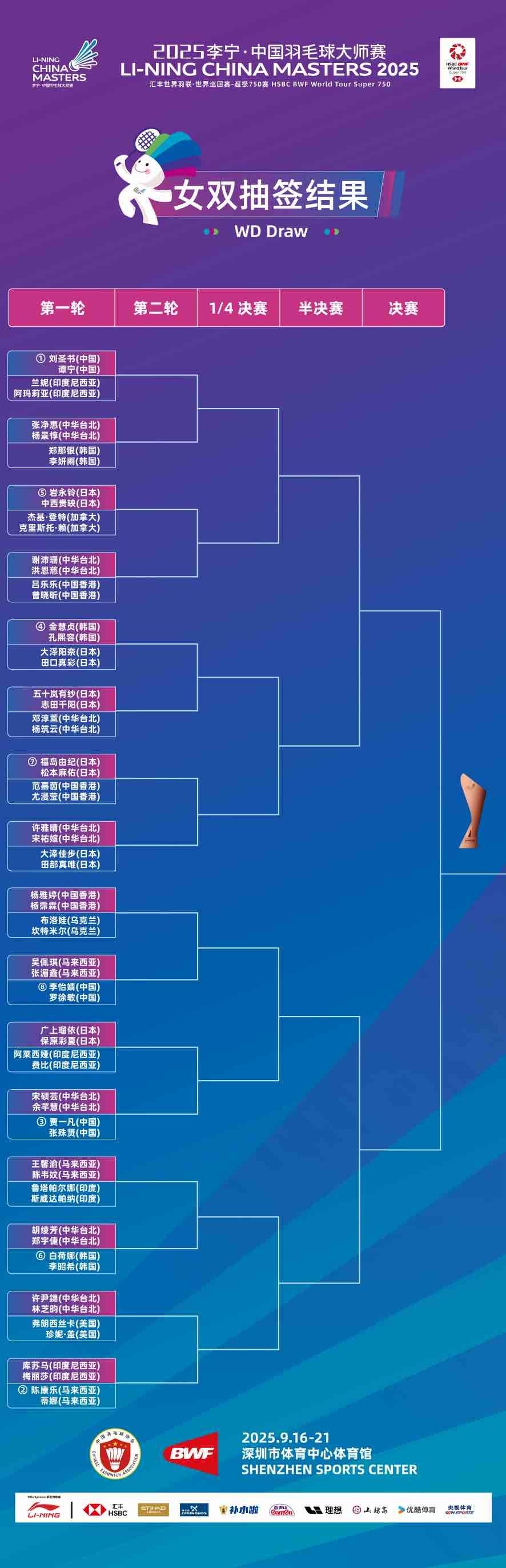 2025李宁·中国羽毛球大师赛将于9月16日至21日在深圳市体育中心体育馆拉开战幕,距离开赛仅剩6天。北京时间9月9日,五个单项抽签结果正式公布,石宇奇、陈雨菲、刘圣书/谭宁等国羽名将即将携手出战,向单项冠军发起冲击。
