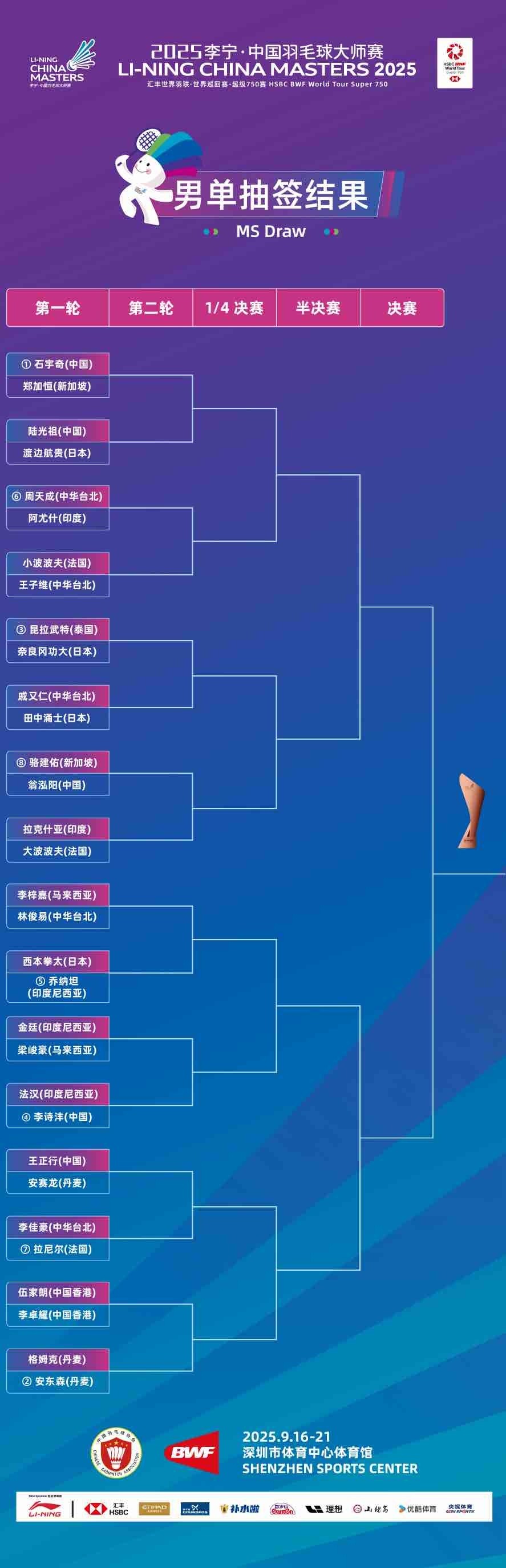 中国大师赛是石宇奇荣膺世锦赛新科冠军后的首秀。根据签表,他在深圳的首轮对手是新加坡选手郑家恒。如果取胜,他将于次轮迎战队友陆光祖和日本选手渡边航贵之间的胜者。同处上半区的翁泓阳首轮将面对新加坡名将骆健佑,该半区还包括三号种子昆拉武特和六号种子周天成。