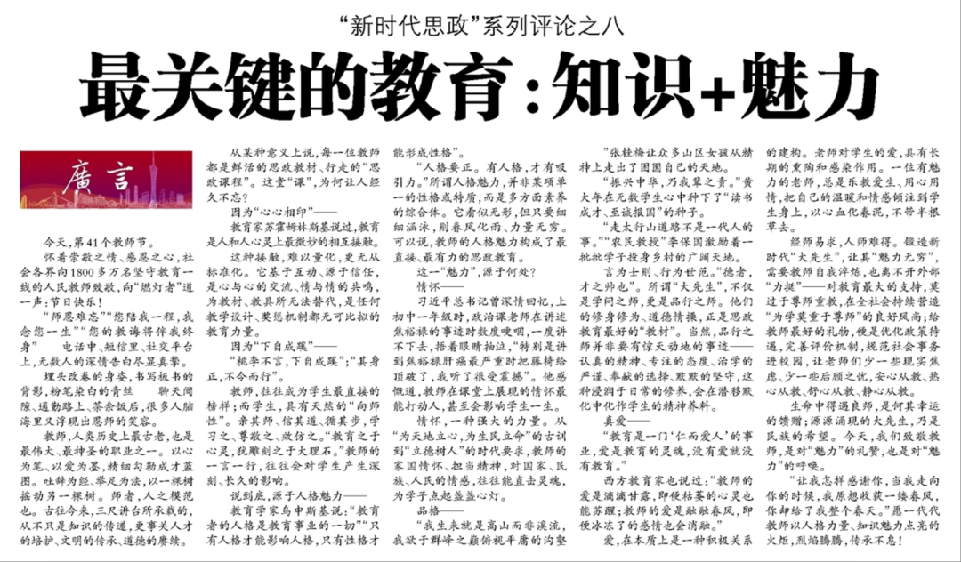 今年9月10日是我国第41个教师节。9月10日,《广州日报》刊发评论《最关键的教育:知识+魅力》,阐释每一位教师都是鲜活的思政教材、行走的“思政课程”。三尺讲台所承载的,从不只是知识的传递,更事关人才的培护、文明的传承、道德的赓续。所谓“大先生”,不仅是学问之师,更是品行之师。老师们的修身修为、道德情操,正是思政教育最好的“教材”,会在潜移默化中化作学生的精神养料。