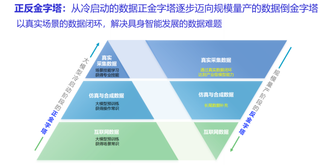 技术落地层面,郭彦东提出“正反金字塔”数据观:冷启动阶段依赖互联网数据、仿真数据与真机采集数据的“正金字塔”结构;大规模部署后则形成以真实场景数据为核心的“倒金字塔”闭环,通过数据回流实现机器人“越用越聪明”。