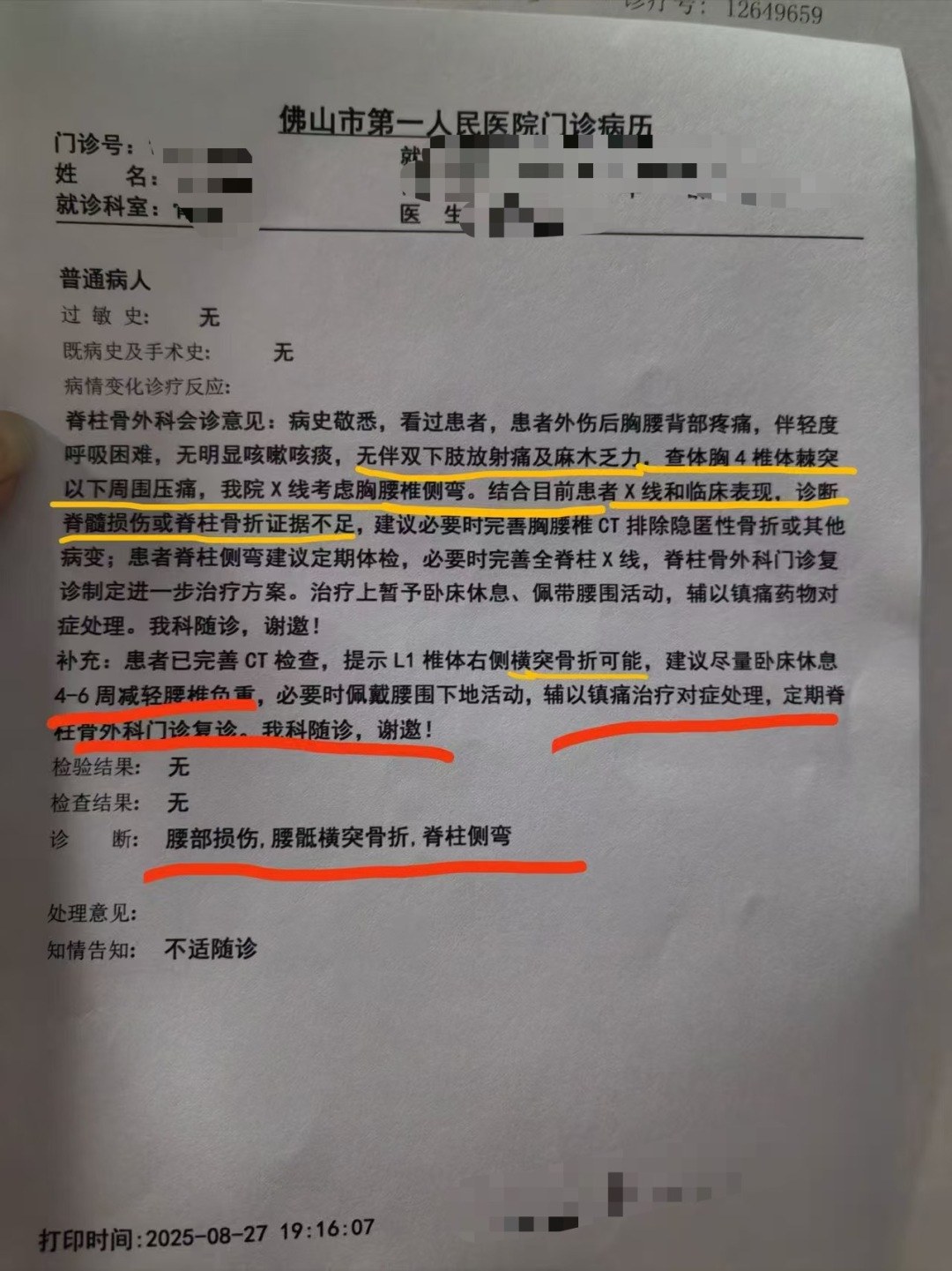 佛山市第一人民医院的放射检查报告单显示,李女士胸椎S形侧弯(考虑先天性变异),腰椎侧弯等,建议CT进一步检查;CT检查报告单显示,右侧横突骨考虑骨折可能,脊柱S形侧弯等;门诊病历显示其诊断结果为:腰部损伤,腰骶横突骨折,脊柱侧弯。