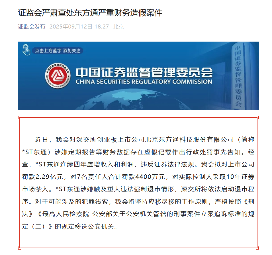 9月12日晚间,证监会官方发布显示,近日,证监会对深交所创业板上市公司北京东方通科技股份有限公司(简称*ST东通)涉嫌定期报告等财务数据存在虚假记载作出行政处罚事先告知。