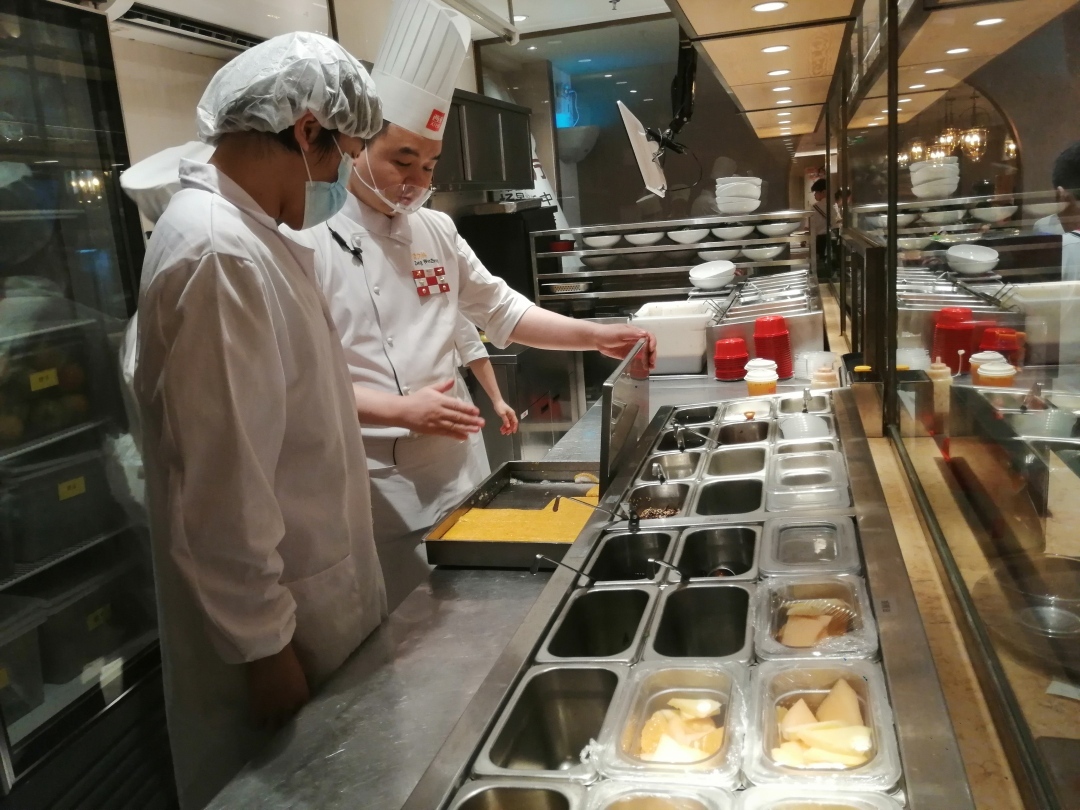 9月13日晚间,广州日报新花城记者以顾客身份来到西贝正佳门店用餐,大约5点50分,店内位置有2/3已坐满,6点左右,门口已有多人在等号。用餐期间,记者向店长提出进入厨房参观的请求。店长许可后,记者扫码登记、换上防护服、戴好口罩和网帽后,在厨师长带领下入厨房参观。后厨地面洁净,操作台面锃亮。厨房区域划分明确,有面点区、凉菜区、热菜区和烤制区等。在面点区,师傅们正制作面窝窝。师傅介绍,这些面点都是每日现做,保证新鲜。凉菜区的工作人员进进出出都进行消毒,食材被整齐摆放。热菜区则是一片忙碌景象,厨师们在电磁灶前麻利地烹饪着菜品。记者注意到,冷柜里存放着切好的包菜丝、花菜、肉片等预处理食材,这些食材来自中央厨房集中供应。厨师长表示,原材料和调料虽由中央厨房配送,但菜肴为现做。比如酱牛骨,是厨师一大早腌制的。在烤制区,万能蒸烤箱是核心设备,厨师将涂抹好调料的鱼放入提前预热好的烤箱,设定260度,烤9分钟即可。
