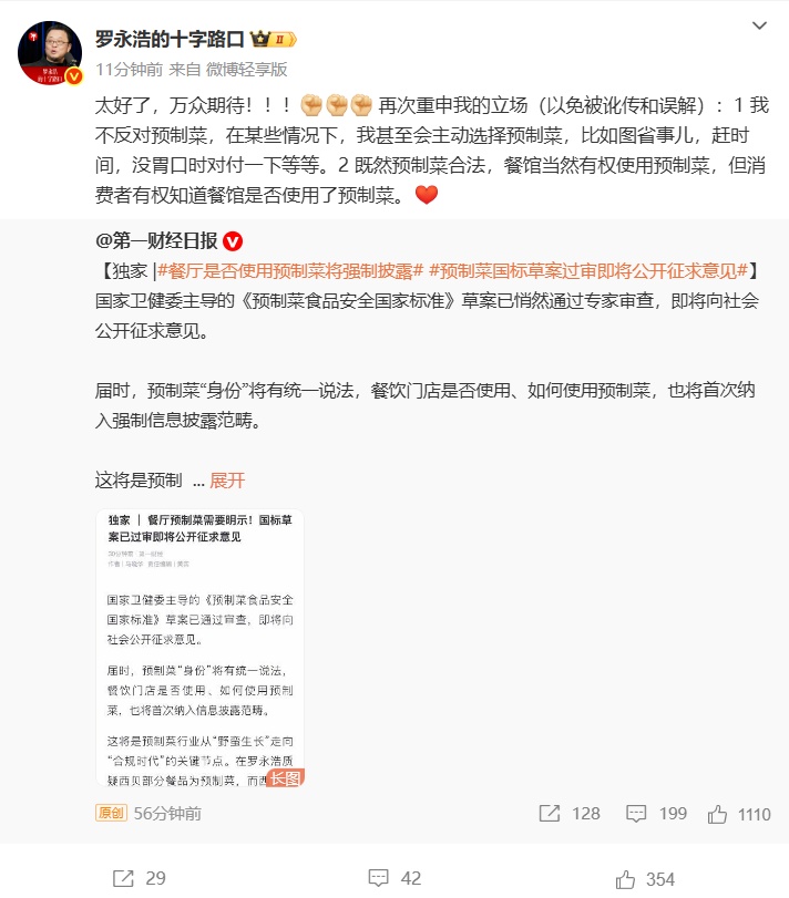 此前,13日下午罗永浩发微博转发第一财经日报报道,配文称:“太好了,万众期待!!! 再次重申我的立场(以免被讹传和误解):1.我不反对预制菜,在某些情况下,我甚至会主动选择预制菜,比如图省事儿,赶时间,没胃口时对付一下等等。2.既然预制菜合法,餐馆当然有权使用预制菜,但消费者有权知道餐馆是否使用了预制菜。”