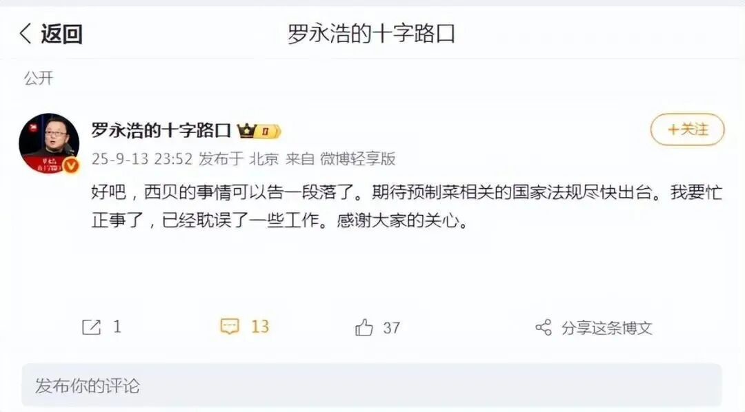13日晚,罗永浩微博最新发文称西贝的事情可以告一段落了,全文如下: