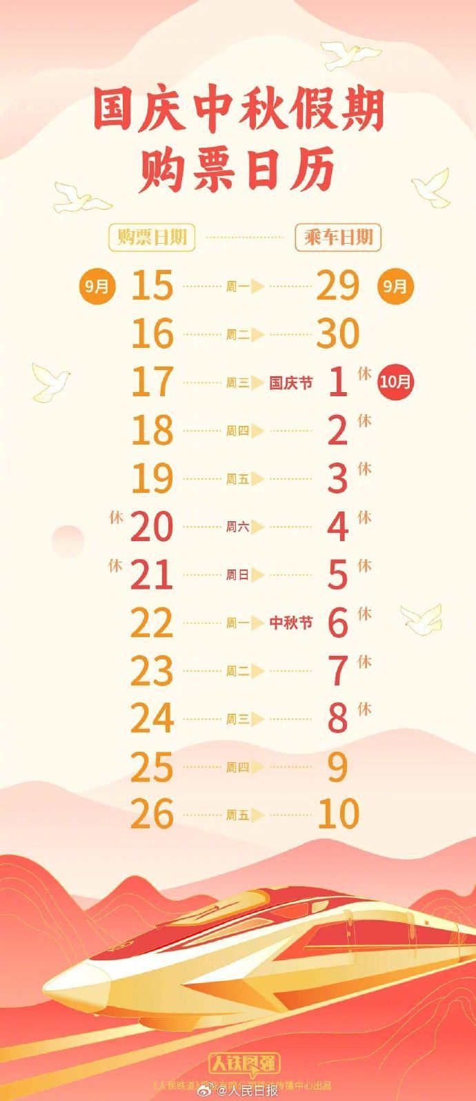 2025年国庆中秋假期火车票即将发售,购票日历已经出炉,快定好闹钟,准时锁定↓↓↓