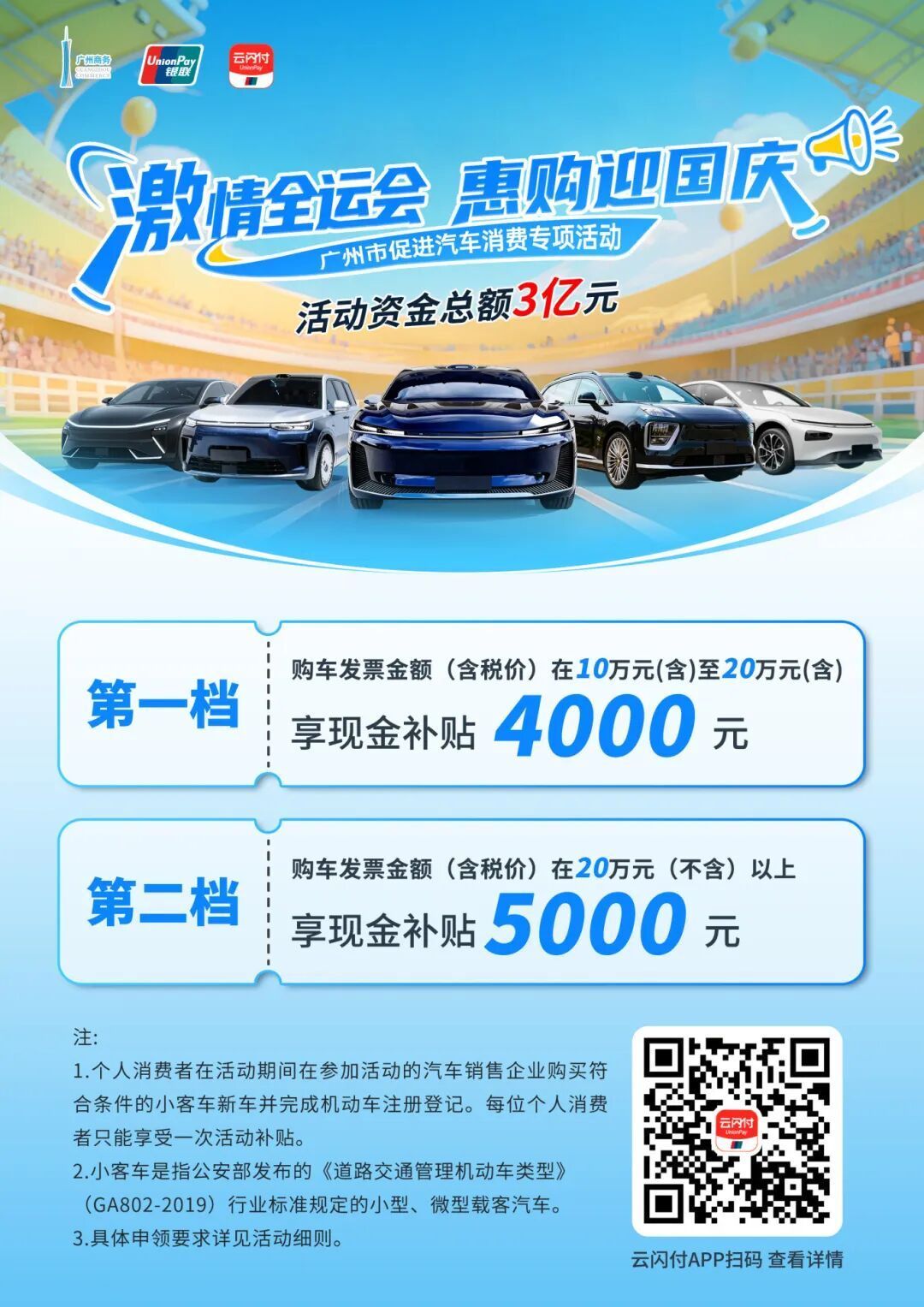 作为广州市人民政府主办的2025广州国际购物节的重磅活动之一,“激情全运会 惠购迎国庆”促进汽车消费专项活动,联动全市汽车、金融、电商、零售等多方市场主体,充分发挥汽车消费带动作用,进一步增强广州国际商贸中心功能。本轮活动资金补贴总额3亿元,预计带动汽车销售超80亿元。