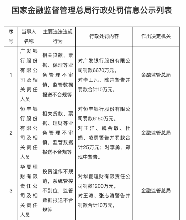 近日,金融监管总局披露的行政处罚信息公示表显示,广发银行、恒丰银行、华夏理财收到千万级“罚单”。