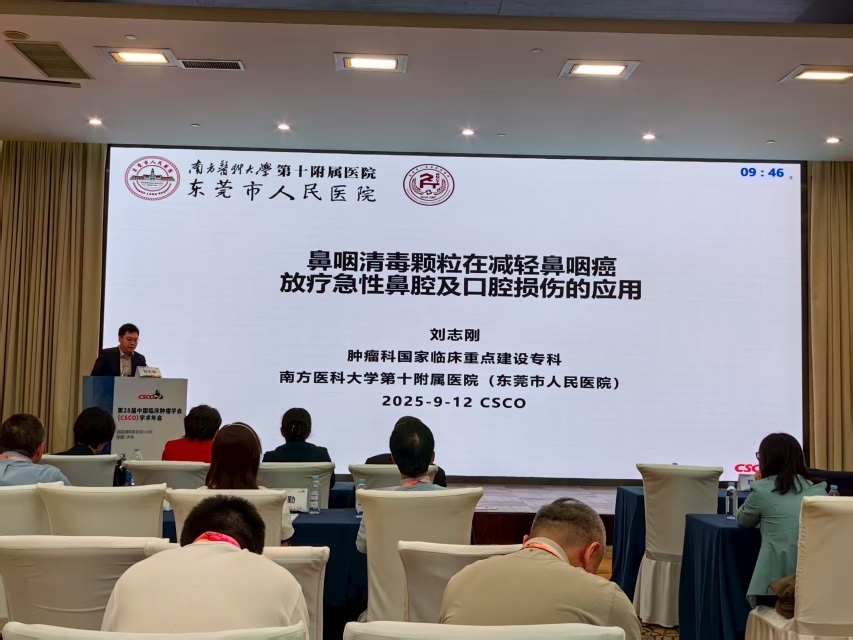 第28届全国临床肿瘤学大会暨2025年中国临床肿瘤学会(CSCO)学术年会日前召开,本次大会以“规范诊疗,创新引领”为主题,旨在进一步促进国内肿瘤临床诊疗规范化,鼓励支持临床研究和创新,积极推动肿瘤领域学科发展。在鼻咽癌专场会议上,一项关于白云山鼻咽清毒颗粒的Ⅳ期临床研究成果引起业界关注。项目组核心成员、南方医科大学第十附属医院(东莞市人民医院)肿瘤中心刘志刚教授以《鼻咽清毒颗粒在减轻鼻咽癌放疗急性鼻腔及口腔损伤的应用》为题进行了汇报。