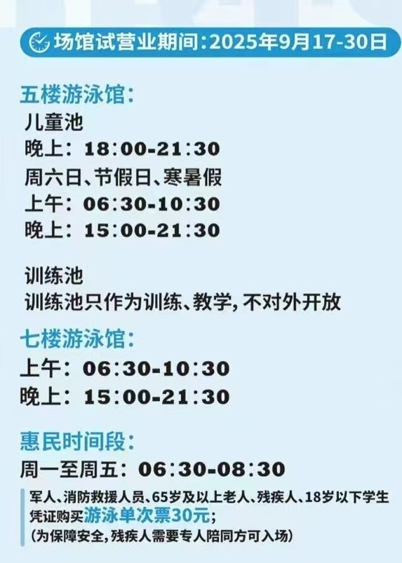 记者了解到,该游泳馆试营业期间(2025年9月17-30日)收费为单次票48元/人,惠民时段内军人、消防救援人员、65岁及以上老人、残疾人、18岁以下学生凭证购买单次票30元/人。