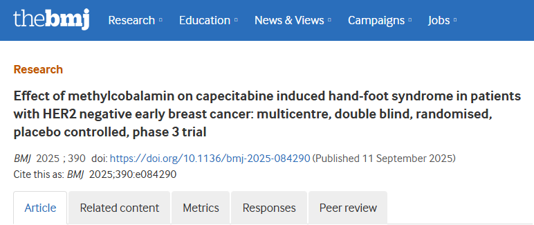 9月11日,中山大学孙逸仙纪念医院龚畅教授团队联合全国共7家单位,在国际顶尖医学期刊《英国医学杂志》(BMJ)上发表了一项临床研究成果。研究证实,口服甲钴胺(维生素B12的一种衍生物)可显著降低HER2阴性早期乳腺癌患者在卡培他滨辅助强化治疗中重度HFS(2/3级HFS)的发生率,且未观察到特殊不良反应,为该类患者提供了一种有效且安全的HFS预防新方案。