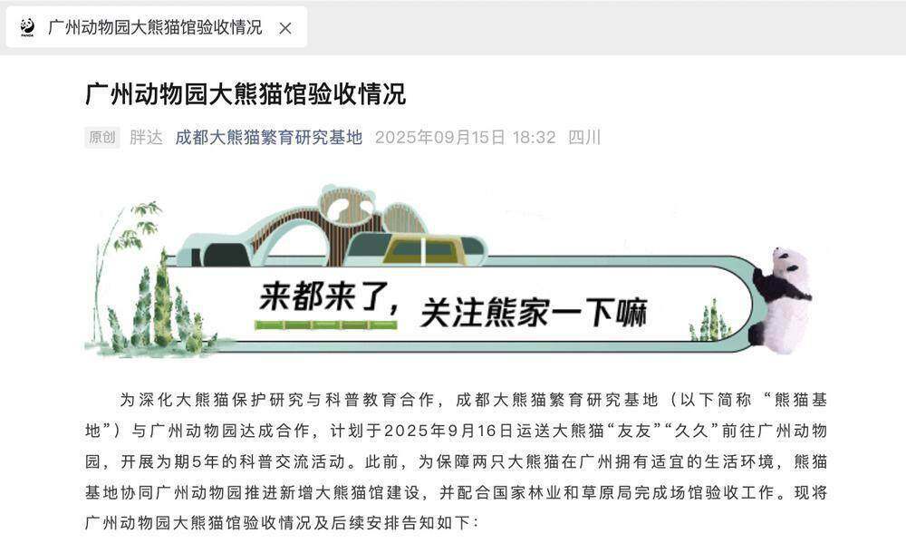 9月15日晚,微信公众号“成都大熊猫繁育研究基地”发布消息称,为深化大熊猫保护研究与公众科普教育,该基地与广州动物园达成合作,计划于9月16日正式运送大熊猫“久久”和“友友”前往广州,开展为期五年的科普交流活动。